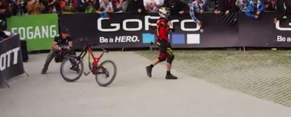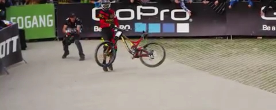 Brosnan came down with much anticipation, but after a mistake slowed him he couldn’t dent the top three times. Blenkinsop on his now familiar 650b wheels and even wearing gloves was only 0.04 back at the first then 0.432 back at the second split. Finishing 0.918 back and taking Peaty’s spot on the podium it was time for his young team mate’s run. The French thunderstorm, Loic Bruni was lightning. 1.7 up at the first split and by the second he had stretched the gap to over 2 seconds. Over the line he took Bryceland’s place in the hotseat, it looked like he could have even done enough for the win, and he’s only 19!