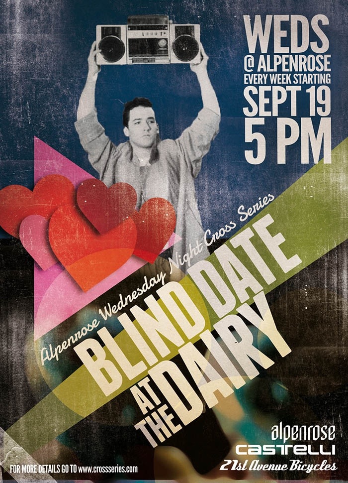this is a good example of the humor and style around cyclocross. where else would you see the classic image from Say Anything along with the jokey title Blind Date at the Dairy.? alpenrose is a well known moo juice factory near portland.
