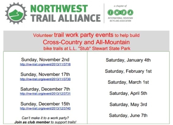 Dates of NWTA hosted 2013/2014 Trail work party events at Stub State Park
