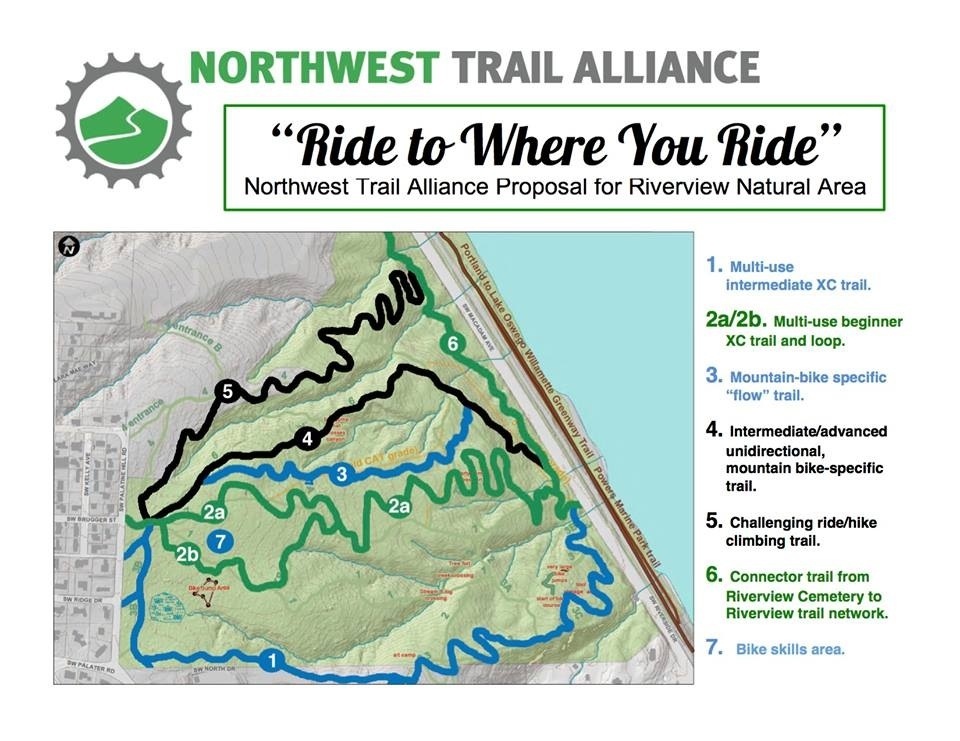 Hey guys, take a look at the NWTA Riverview Proposal map we’re working on. This is not final, but the final version is going to be sent into the city very soon (or that’s already happened). A lot of changes, but we are proposing that the downhill trail stay, with a new bottom section and a revised first 100 yards.