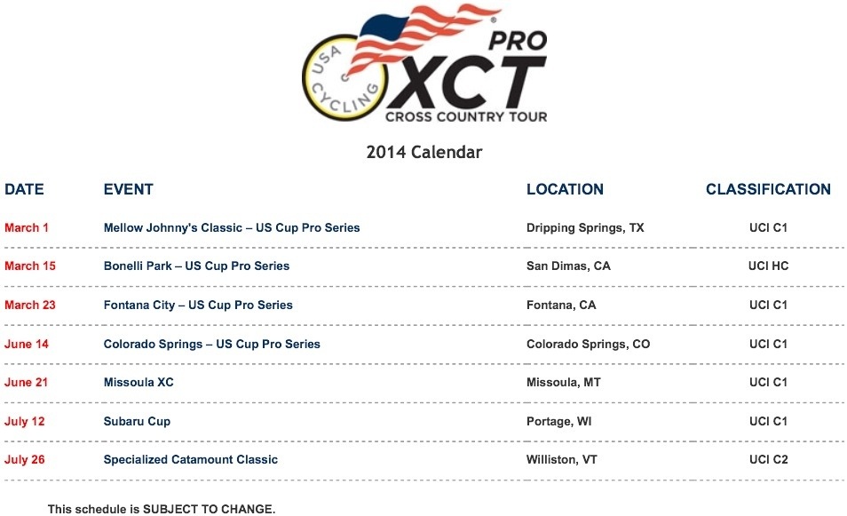 Colorado Springs, Colo. (December 26, 2013) — USA Cycling on Thursday announced the seven races that will comprise the 2014 USA Cycling Professional Cross-Country Tour (Pro XCT) calendar. At the end of the seven races, the top five men and women riders will be awarded an equal share of USA Cycling’s $15,000 prize purse. This marks the first time USA Cycling has offered a prize purse to the winners of the Pro XCT.