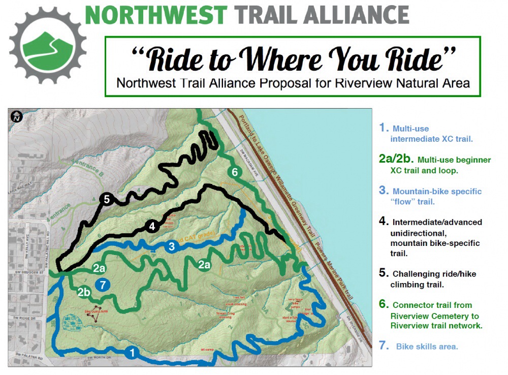 The Northwest Trail Alliance (NWTA) is pleased to present our proposal for the Riverview Natural Area. Our proposal consists of an illustrative map and a summary of the proposed system of trails and bike features. Riverview presents a unique opportunity to provide a range of diverse experiences for mountain bikers in the urban core which is currently lacking, and implement