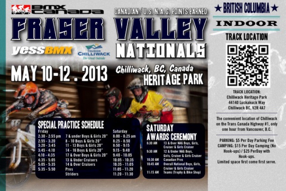 BMX Canada: Fraser Valley Nationals – Indoor By White Lotus Sports on May 7, 2014 • ( 0 ) May 9th – May 11th, 2014 Chilliwack, British Columbia Canada http://www.BMXCanada.org Share this: Share on X (Opens in new window) X Share on Facebook (Opens in new window) Facebook Email a link to a friend (Opens in new window) Email More Print (Opens in new window) Print Like Loading...‹ Race Skills Clinic at the Silver Star BC Cup / NW CupDog River Trail #675 ›Categories: BMX RacingTags: BMX, BMX Canada, USA BMX Related Articles BMX Oregon: USA BMX Oregon State Finals BMX Oregon: Racing 2025 Yoga For Cyclists – Yoga With Adriene BMX Oregon: Great Northwest Nationals