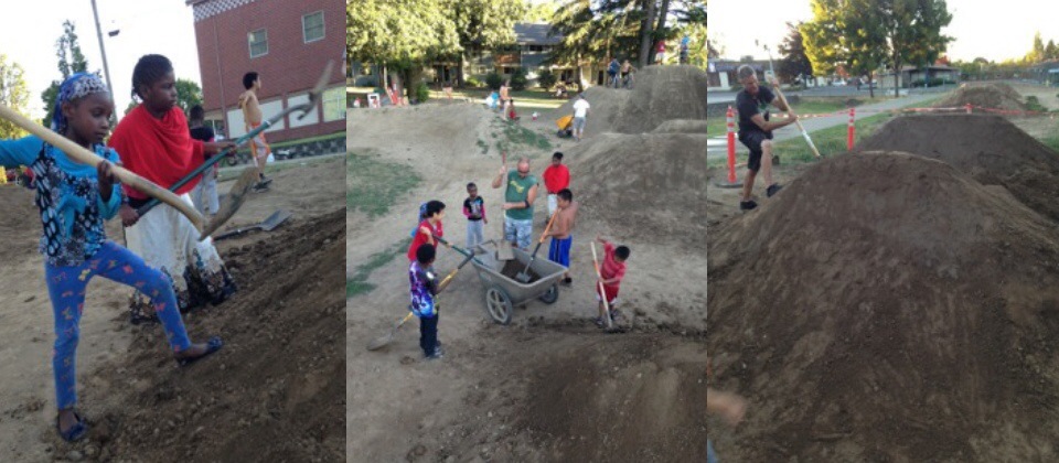 Eichler Park had a great turnout on Wednesday, July 16th for a pump track build party! 18 people came out, contributing 4 hours, for a combined 72 hours of volunteer work total on the advanced jump. We are very close to completing all four jumps now. Thanks to everyone that attended. NWTA Volunteers have put an astonishing 409 hours into the park since June 9th when the overhaul on the advanced features began. The area’s first progressive hip/table top designed for easy progression for entry level dirt jumpers is NOW OPEN. Eichler is home to Portland Metro area’s first pump track. Located on SW Farmington Rd in Beaverton. Come revisit this ‘forgotten gem’ or explore what’s sure to become a new favorite place to pump and jump if you’ve never been here.