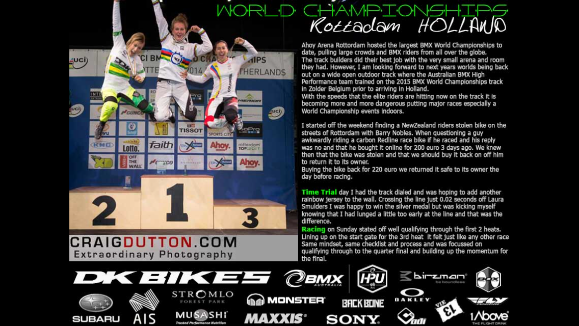 Catch the action from the 2014 BMX World Championships as Caroline Buchanan claimed a silver medal in the time trial and aimed to defend her BMX World Title but crashed out early in racing.