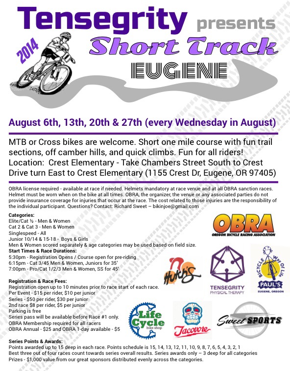Tensegrity presents: 2014 Short Track Series – Eugene, Oregon By White Lotus Sports on August 18, 2014 • ( 0 ) August 6th, 13th, 20th, 27th ( every Wednesday in August) Share this: Click to share on X (Opens in new window) X Click to share on Facebook (Opens in new window) Facebook Click to email a link to a friend (Opens in new window) Email More Click to print (Opens in new window) Print Like Loading...‹ Dew Tour Portland, Oregon – Saturday Highlights BMXKruger’s Kermesse ….Encore! ›Categories: Mountain Bike RacingTags: Eugene, mountain bike, Oregon, short track Related Articles 2026 Cascadia Dirt Cup Schedule 2026 Northwest Cup Downhill MTB Schedule North American Enduro Cup 2026 2026 Sturdy Dirty Enduro
