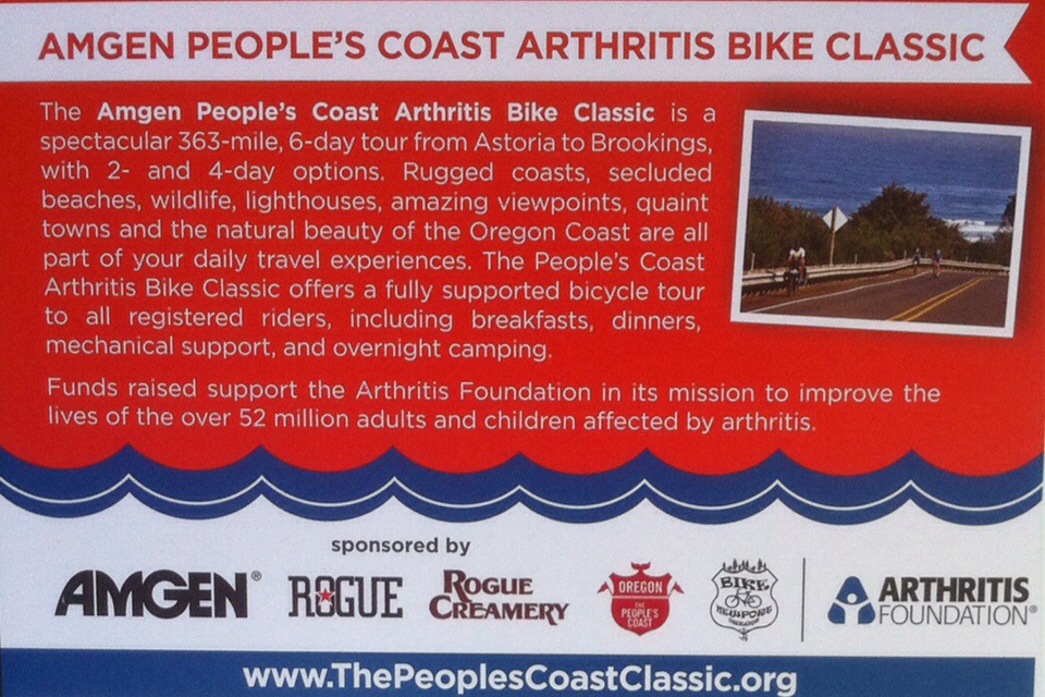 Amgen People’s Coast – Arthritis Bike Classic By White Lotus Sports on September 2, 2014 • ( 0 ) An Arthritis Foundation Special Event September 7th – 12th, 2014 http://www.ThePeoplesCoastClassic.org Share this: Click to share on X (Opens in new window) X Click to share on Facebook (Opens in new window) Facebook Click to email a link to a friend (Opens in new window) Email More Click to print (Opens in new window) Print Like Loading...‹ BMX Swap Meet at Chehalem Valley BMX“Life on Wheels – A Life Worth Winning” Teaser 2014 ›Categories: Advocacy, LifestyleTags: arthritis, charity ride Related Articles FXD Workwear: Behind every new trail… Opinion: Mountain Biking, Flow State, and the Psychology of Healing Underexposed – Oregon Coast Yoga For Cyclists – Yoga With Adriene