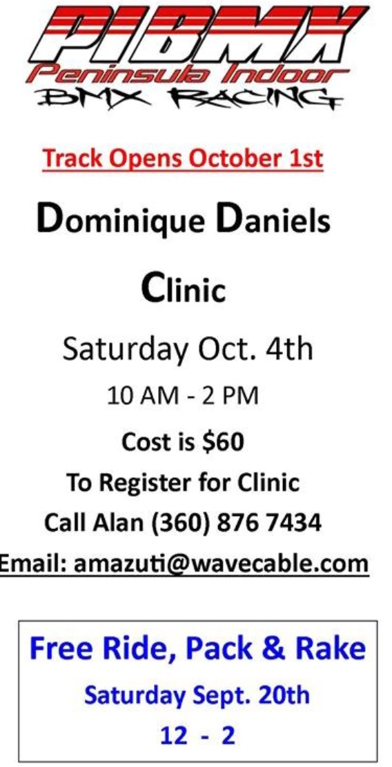 Track is done and we will be opening up the track Saturday Sept. 20th from 12 – 2 for a free open ride. Dominique Daniels is coming Saturday October 4th and the cost to attend her clinic is $60 and it is from 10 – 2. Email to sign up or private message on Facebook.