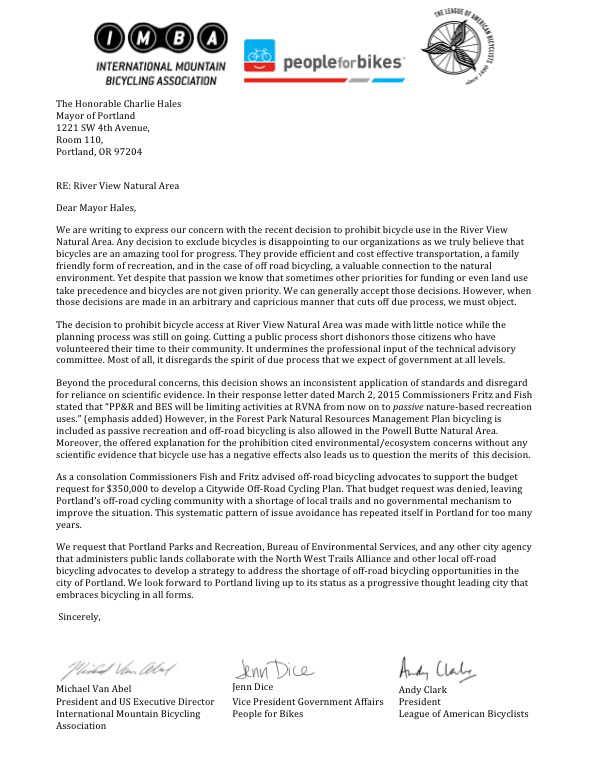 International Mountain Bicycling Association President and US Executive Director Michael Van Abel, People for Bikes VP of Government Affairs Jenn Dice, and League of American Bicyclists President Andy Clarke all signed their names to a letter (PDF) dated March 18th that was sent to Mayor Charlie Hales and all four city commissioners.