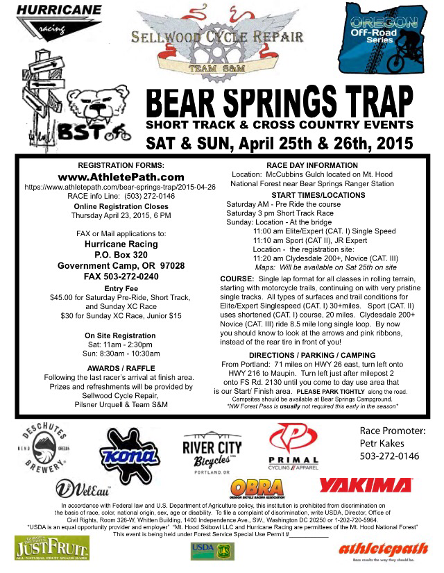 Oregon XC MTB Series Race #2: Bear Springs Trap at Mc Cubbins Gulch By White Lotus Sports on April 24, 2015 • ( 0 ) Presented by Sellwood Cyclery April 25 & 26 (Sat & Sun), 2015 Share this: Click to share on X (Opens in new window) X Click to share on Facebook (Opens in new window) Facebook Click to email a link to a friend (Opens in new window) Email More Click to print (Opens in new window) Print Like Loading...‹ NW Cup MTB Series Race #1 – Schedule of Events Race for the Future-Washougal XC MTB at the MX Park ›Categories: Mountain Bike RacingTags: bicycle, bike, hurricane racing, mountain bike, mountainbike, OBRA, Skibowl Related Articles 2026 Cascadia Dirt Cup Schedule 2026 Northwest Cup Downhill MTB Schedule North American Enduro Cup 2026 2026 Sturdy Dirty Enduro