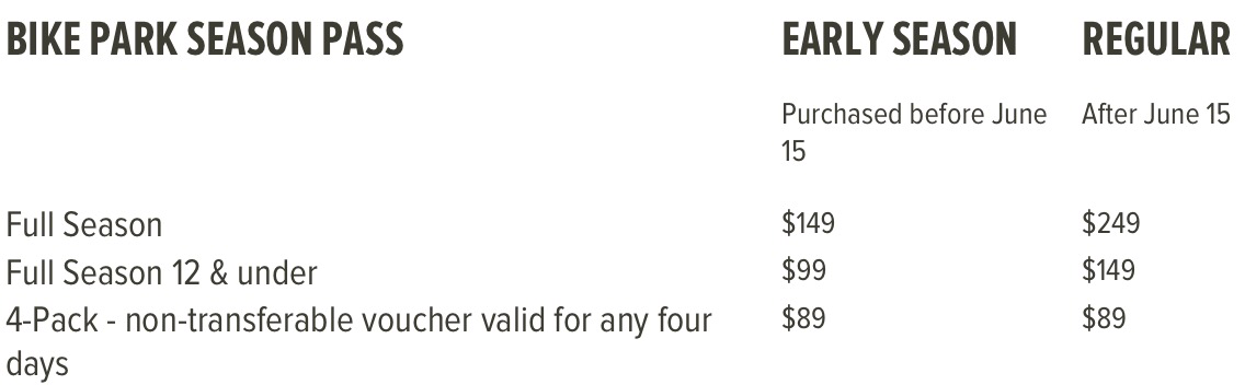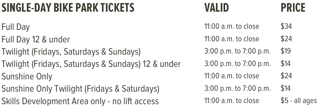 The Bike Park’s operations may be suspended or closed for the day due to lightning, prolonged heavy rain, hail, ice or snow.
