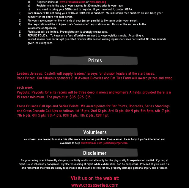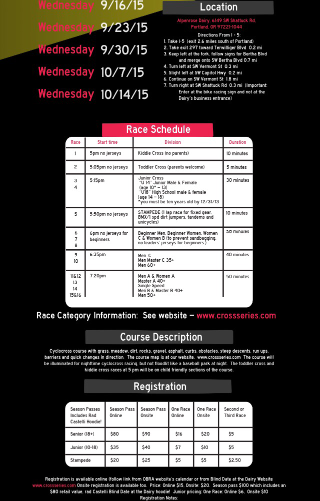 2015 Blind Date at the Dairy – Cyclocross Series By White Lotus Sports on September 15, 2015 • ( 0 ) Alpenrose Wednesday Night Cross Series Starting September 16th at 5pm http://crossseries.com Share this: Click to share on X (Opens in new window) X Click to share on Facebook (Opens in new window) Facebook Click to email a link to a friend (Opens in new window) Email More Click to print (Opens in new window) Print Like Loading...‹ A chat with Carson StorchIn The Zone – CREEK [4K] ›Categories: Other RacingTags: alpenrose dairy, bicycle, bike, Cyclocross, Oregon Related Articles Cascadia Super Gravel 2026 Yoga For Cyclists – Yoga With Adriene USA Cycling Announces 2024 National Championship Schedule Portland Trophy Cup 2023