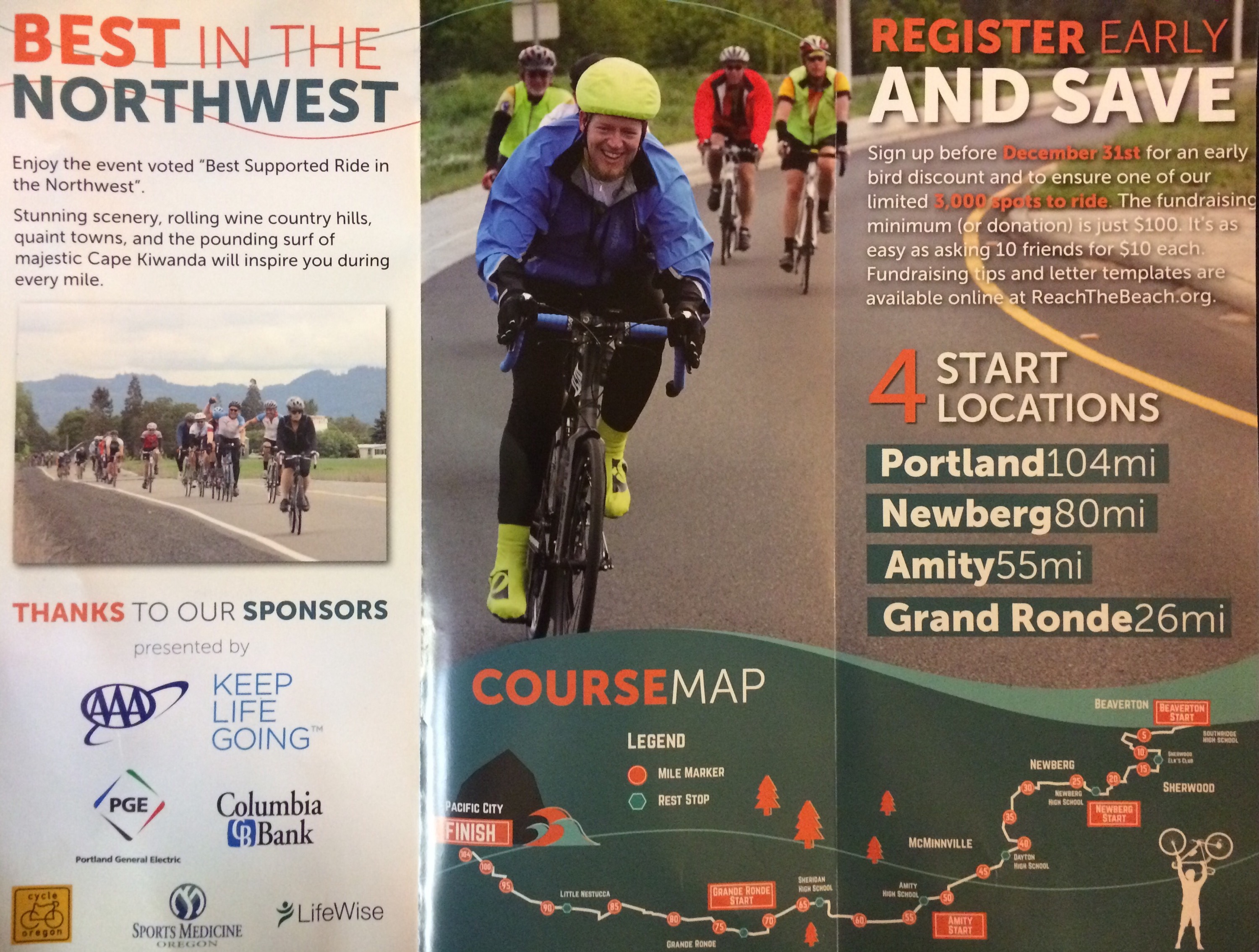 The American Lung Association’s Reach The Beach presented by AAA – one of Oregon’s premier cycling events – is perfect as a personal challenge or to ride together with friends and family. A top notch ride with amazing support that gives you four different start locations: Portland (100 mi), Newberg (80 mi), Amity (55 mi) or Grand Ronde (28 mi). We provide superb organization, beautiful routes, medical and mechanical support on course, eight lunch and snack stops and a magnificent beach party with a delicious, hearty feast. Reach the Beach is one of Oregon’s premier cycling events. Spend the day exploring Oregon by bike.