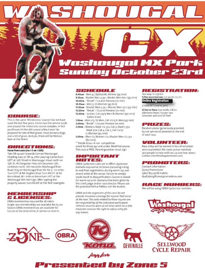Washougal Cyclocross By White Lotus Sports on October 10, 2016 • ( 0 ) Sunday, October 23rd, 2016 Washougal MX Park 40205 NE Borin Rd, Washougal, WA 98671 PDF version here Share this: Share on X (Opens in new window) X Share on Facebook (Opens in new window) Facebook Email a link to a friend (Opens in new window) Email More Print (Opens in new window) Print Like Loading...‹ Ride Spot: Hood River, OregonDirt Labs and Gateway Green Campaign ›Categories: Other RacingTags: bicycle, bike, Cyclocross, OBRA, Washington, washougal Related Articles Cascadia Super Gravel 2026 2026 OBRA Championships Yoga For Cyclists – Yoga With Adriene USA Cycling Announces 2024 National Championship Schedule