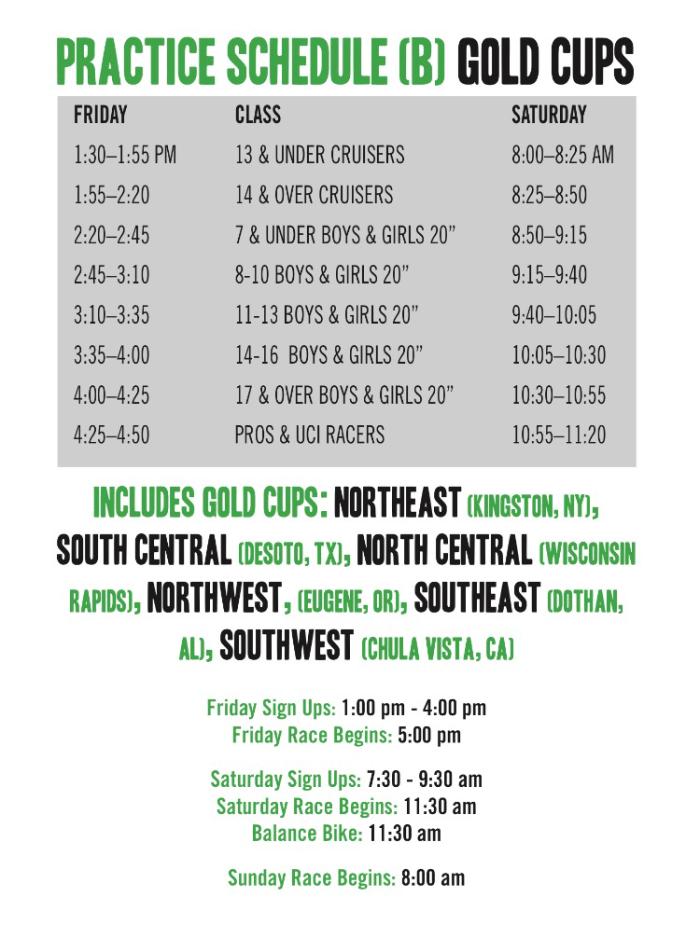 The Gold Cup Series presented by DK Bikes involves a rider counting his/her best two scores from Gold Cup events, according to the Gold Cup/State/Provincial Points Table, and his/her scores from Saturday & Sunday at the Gold Cup Final. Riders may race a Gold Cup Final in any region.