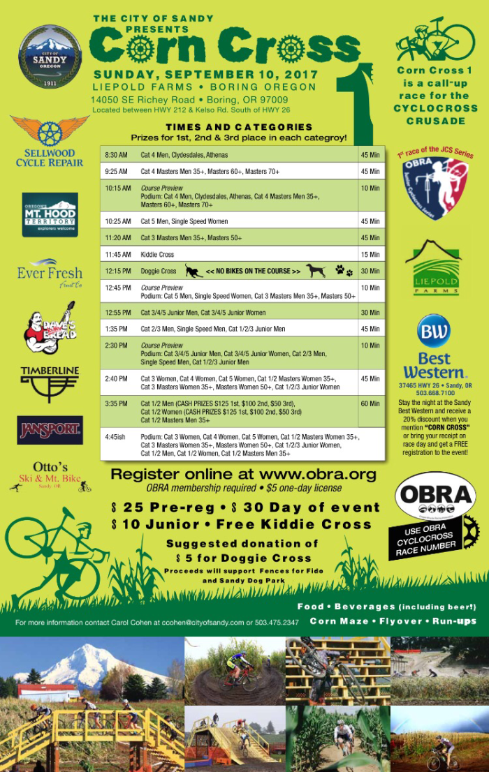 The City of Sandy Presents Corn Cross By White Lotus Sports on September 6, 2017 • ( 0 ) Sunday, September 10th, 2017 Liepold Farms, Boring Oregon Share this: Click to share on X (Opens in new window) X Click to share on Facebook (Opens in new window) Facebook Click to email a link to a friend (Opens in new window) Email More Click to print (Opens in new window) Print Like Loading...‹ Geoff Gulevich’s Perfect Day // A Video DiaryCANCELLED: Mountain Man Challenge Finals ›Categories: Other RacingTags: bicycle, bike, CX, Cyclocross, Oregon Related Articles Cascadia Super Gravel 2026 Yoga For Cyclists – Yoga With Adriene USA Cycling Announces 2024 National Championship Schedule Portland Trophy Cup 2023