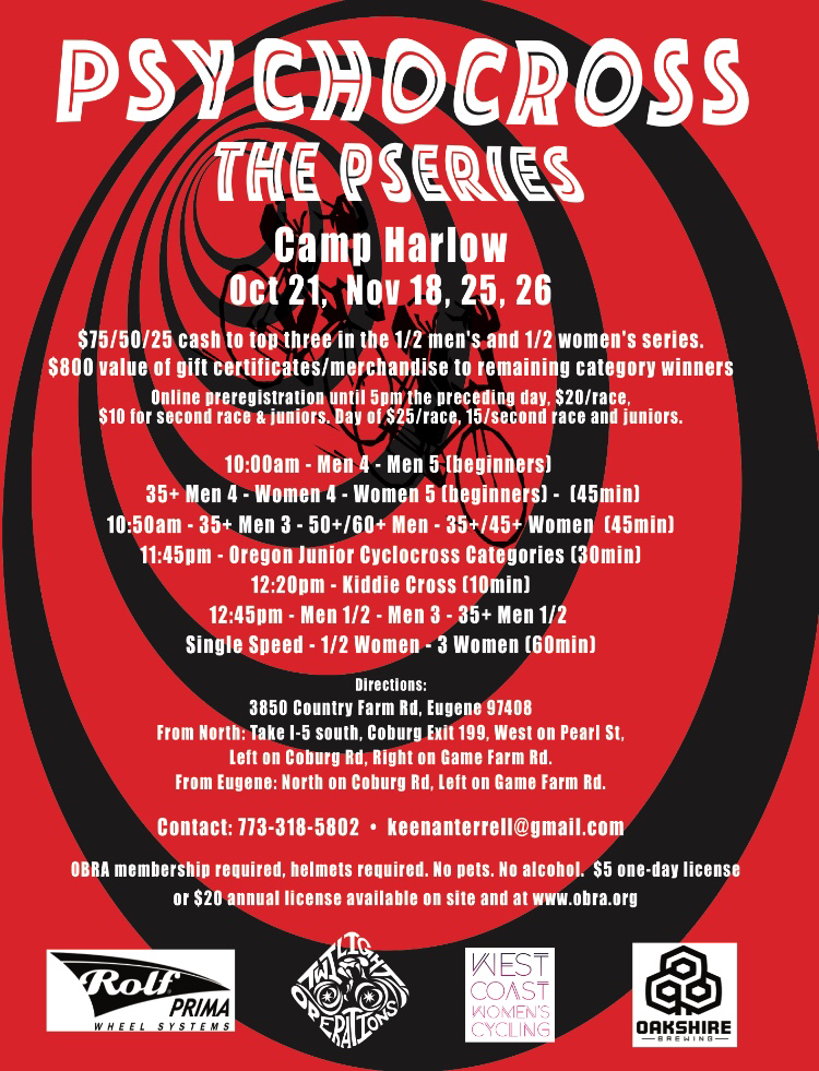 Psychocross – The P Series By White Lotus Sports on October 12, 2017 • ( 0 ) Camp Harlow 3850 County Farm Road Eugene, OR 97408 October 21st November 18th, 25th, & 26th Share this: Click to share on X (Opens in new window) X Click to share on Facebook (Opens in new window) Facebook Click to email a link to a friend (Opens in new window) Email More Click to print (Opens in new window) Print Like Loading...‹ Corvallis Cross ClassicCyclisme’s 7th Annual CrossWord Cyclocross Challenge ›Categories: CyclocrossTags: bicycle, bike, CX, Cyclocross, Northwest, OBRA, Oregon, Pacific Northwest, pacific nw, Race Related Articles 2025 Evergreen Community Meeting & Year-In-Review (Virtual) Cornwall Cross 2026 2025 Harvest Cyclocross presented by Yakima MFG Cyclocross Series 2025