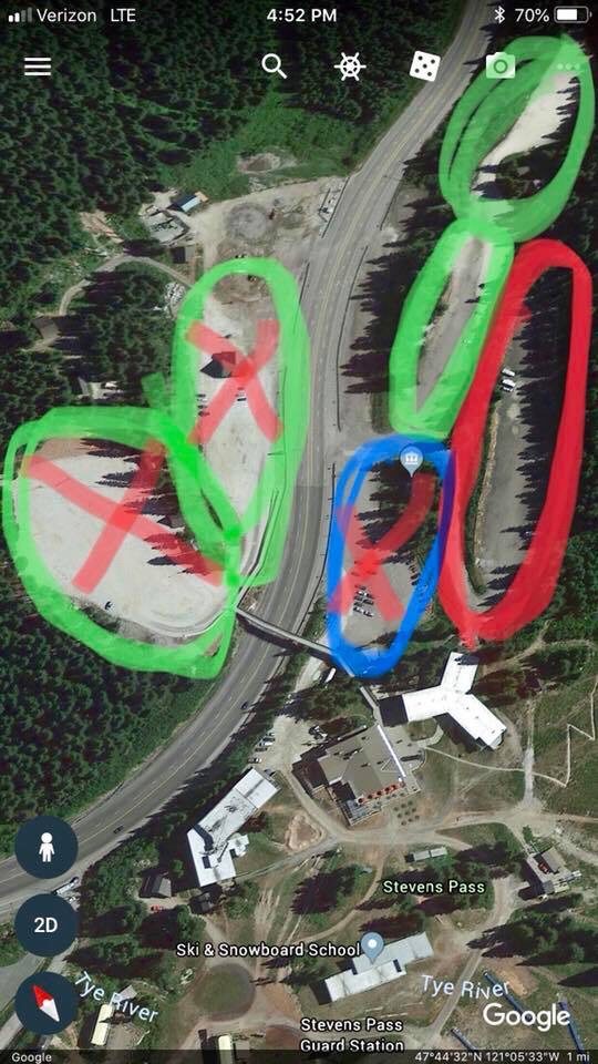 If you haven’t reserved a spot on the rv hook up area (circled in red) you must camp on the left side of E lot and the E overflow parking lot. Both circled in green with out X marks. Parking is extremely limited so please call the Stevens pass resort. If you have any questions or concern. This issue is out of our hands unfortunately.