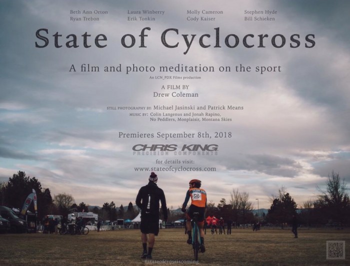 Proud to announce that my film “State of Cyclocross” will premiere on September 8th at Chris King Components. SAVE THE DATE. For more details, read about it, see stills and see the trailer go to the website.