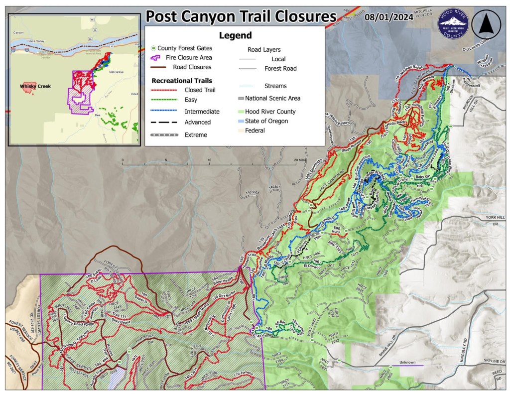 Additional County trail closures are required for the Whisky Creek Fire suppression efforts effective Monday, August 5th, 2024 (Map Attached). HRC Forestry has established closures and Fire Teams will be working through the area with heavy equipment reinforcing contingency fire lines and establishing access points. The enhanced closure now includes: